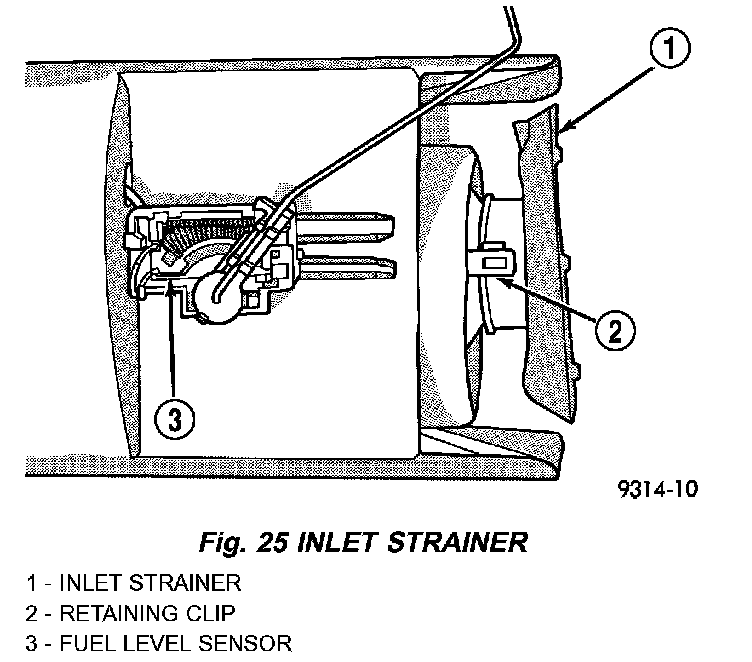 2. Using a thin straight blade screwdriver, pry back the locking tabs on fuel pump reservoir and remove the strainer (Fig. 25).