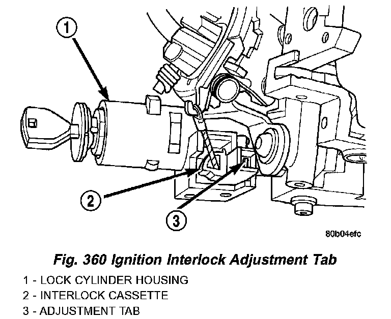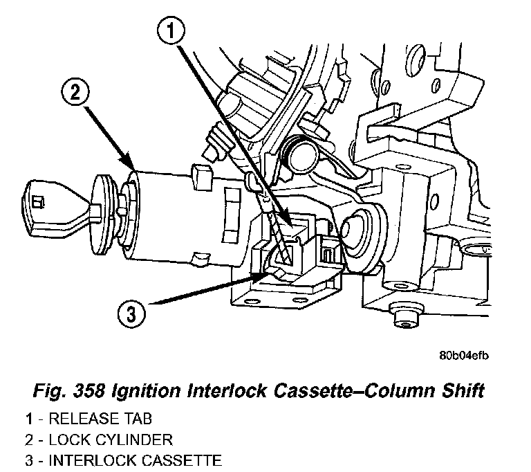 The interlock cassette slides into the housing behind the lock cylinder (Fig. 358). The cable at the rear of the cassette attaches to a locking arm on the shifter mechanism. The column shift interlock system is only adjusted after installing a new cassette. It can't be adjusted more than once. If the system operates incorrectly, install and adjust a new interlock cassette.