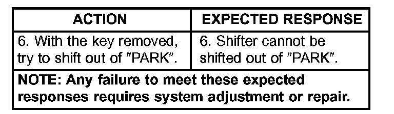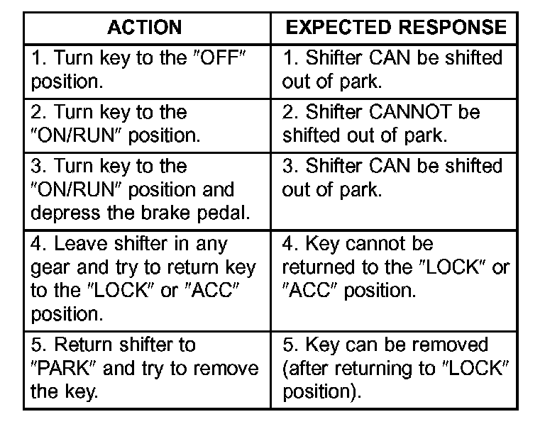 The following chart describes the normal operation of the Brake Transmission Shift Interlock (BTSI) system. If the "expected response" differs from the vehicle's response, then system repair and/or adjustment is necessary.