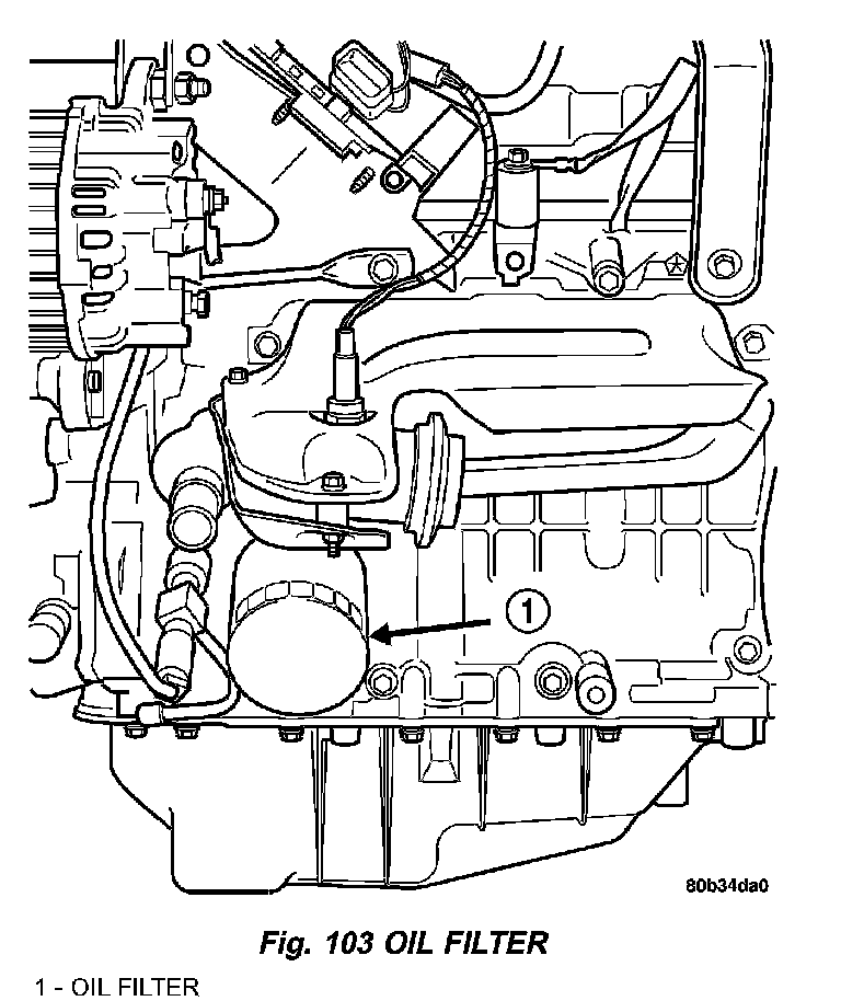 1. Using a suitable oil filter wrench, unscrew filter from base and discard (Fig. 103).