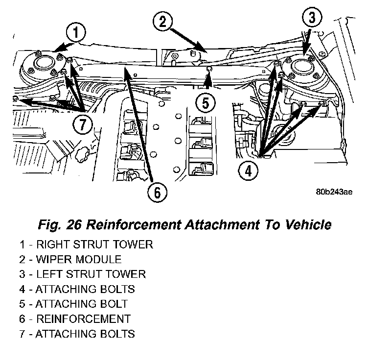17. Install the cowl reinforcement on the vehicle. Install the eight bolts attaching the reinforcement to the strut towers. Install the bolt attaching the wiper module to the reinforcement.