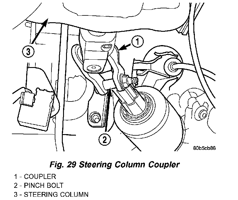 16. Install the intermediate shaft onto the steering column shaft. Install steering column coupler pinch bolt and tighten to a torque of 28 Nm (21 ft. lbs.). Install the pinch bolt nut retaining pin in pinch bolt.