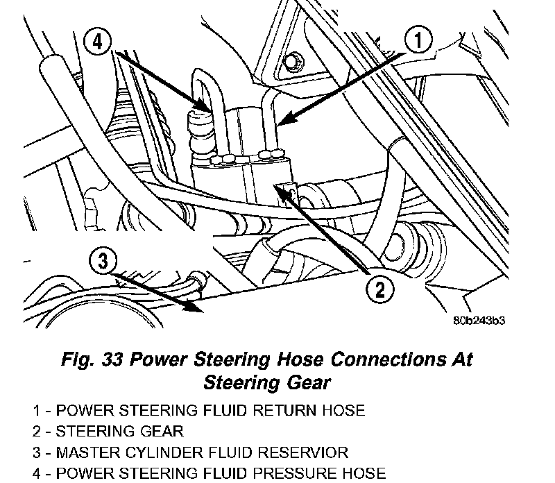 11. Attach power steering fluid, pressure and return lines into proper ports of the steering gear. Tighten both power steering hose tube nuts to a torque of 47 Nm (35 ft. lbs.).