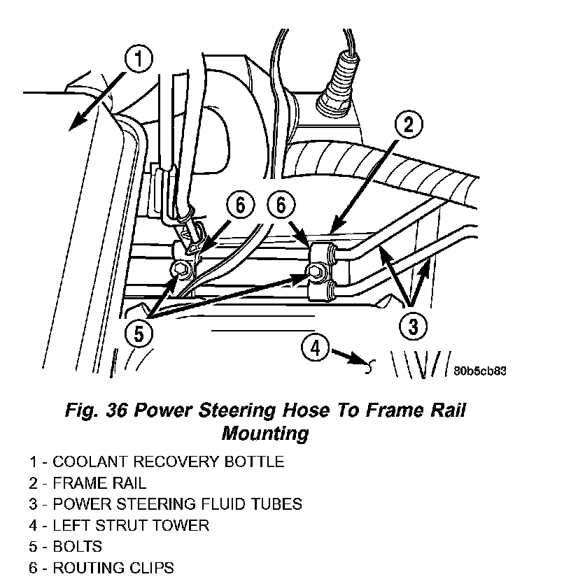 6. Install the power steering hoses onto the left frame rail by installing the routing clip bolts. Tighten the bolts to 10 Nm (89 inch lbs.).