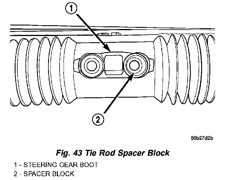 CAUTION: Before installing tie rods on steering gear be sure the tie rod spacer block inside the steering gear bellows is correctly aligned with the bolt holes in the rack of the steering gear and the steering gear bellows.