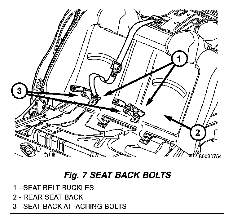 2. Remove bolts attaching rear seat back and seat belts to floor (Fig. 7).