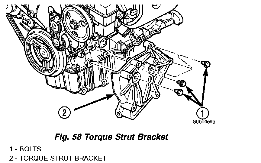 12. Remove lower torque strut/air conditioning compressor mounting bracket from engine (Fig. 58).
