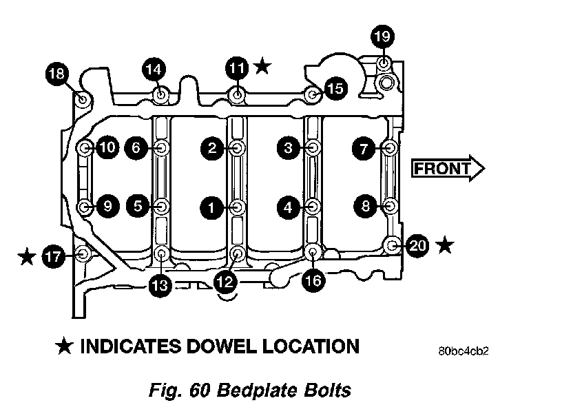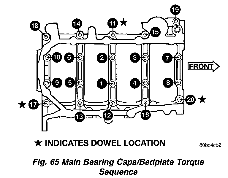 9. Install main bearing bedplate to engine block bolts (11-20), with baffle studs in positions 12, 13 and 16 and torque each bolt to 34 Nm (25 ft. lbs.) in sequence shown in (Fig. 65).