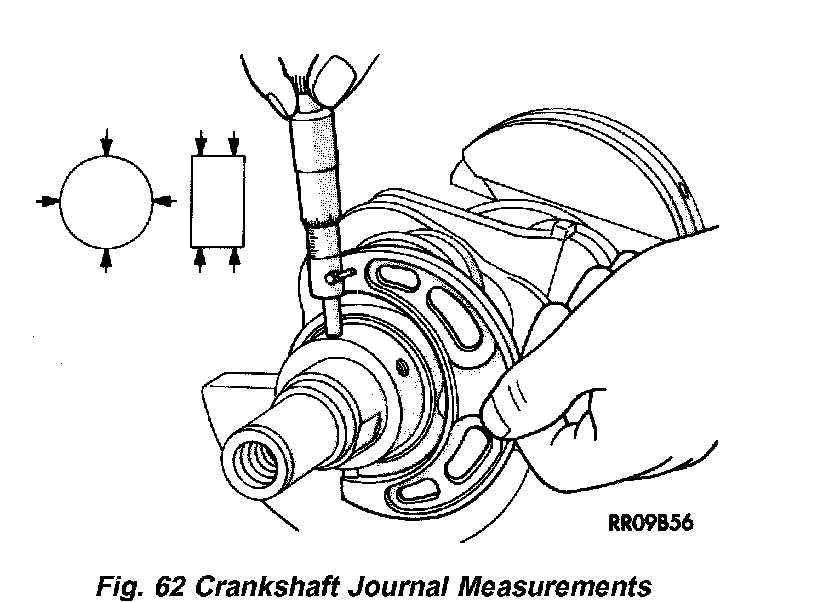 The crankshaft journals should be checked for excessive wear, taper and scoring (Fig. 62). Limits of taper or out of round on any crankshaft journals should be held to 0.025 mm (0.001 inch). Journal grinding should not exceed 0.305 mm (0.012 inch) under the standard journal diameter. DO NOT grind thrust faces of No. 3 main bearing. DO NOT nick crank pin or bearing fillets. After grinding, remove rough edges from crankshaft oil holes and clean out all passages.