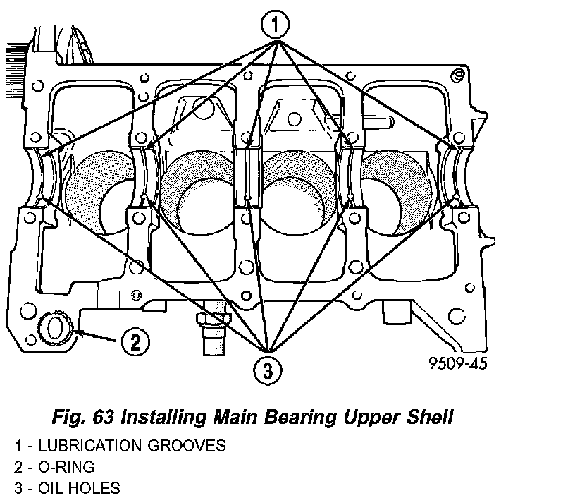 1. Install the upper main bearing shells with the lubrication groove in the cylinder block. Install O-ring into recess in the block (Fig. 63).