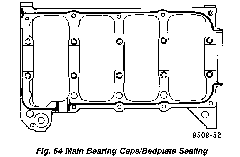 4. Apply 1.5 - 2.0 mm (0.059 - 0.078 inch) bead of Mopar Bed Plate Sealant to cylinder block as shown in (Fig. 64).