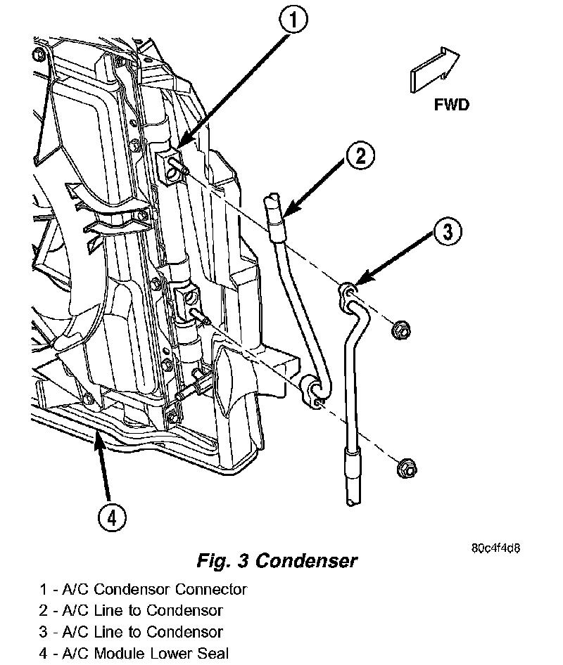 The condenser is integral to a cooling module which includes the radiator, the electric cooling fan, the fan shroud, air seals and an automatic transmission oil cooler on models so equipped.
