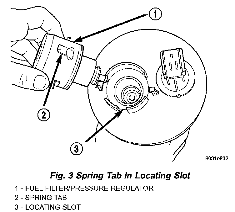 1. Insert Filter/Regulator into the opening in the fuel pump module, align the two hold down tabs with the flange.