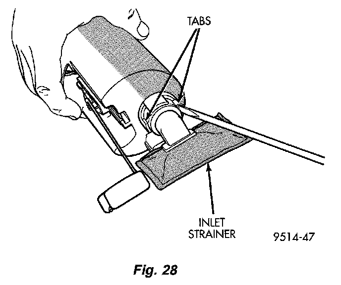 2. Using a thin straight blade screwdriver, pry back the locking tabs on fuel pump reservoir and remove the strainer (Fig. 28).
