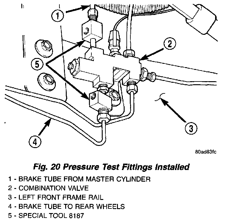 4. Install correct Pressure Test Fitting, Special Tool 8187, into the port of the combination from which the rear wheel brake tube was removed from.