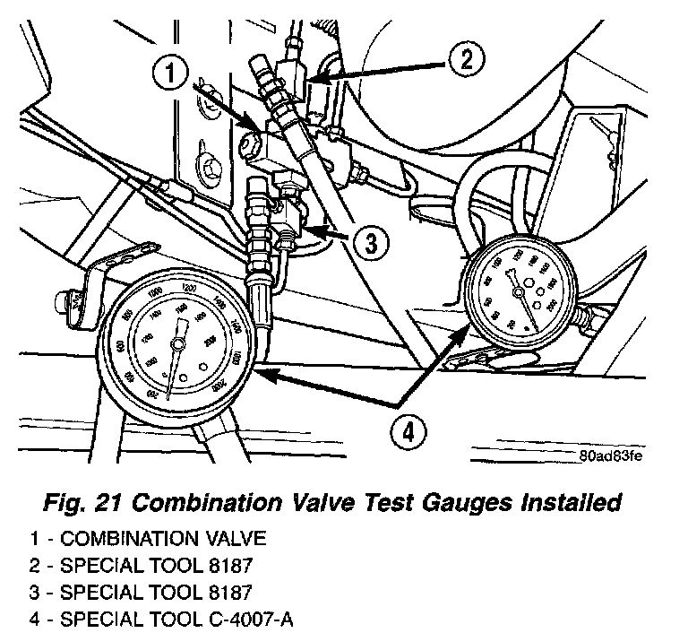 5. Install pressure gauge, Special Tool C-4007-A, into each of the Pressure Test Fittings, Special Tool 8187.
