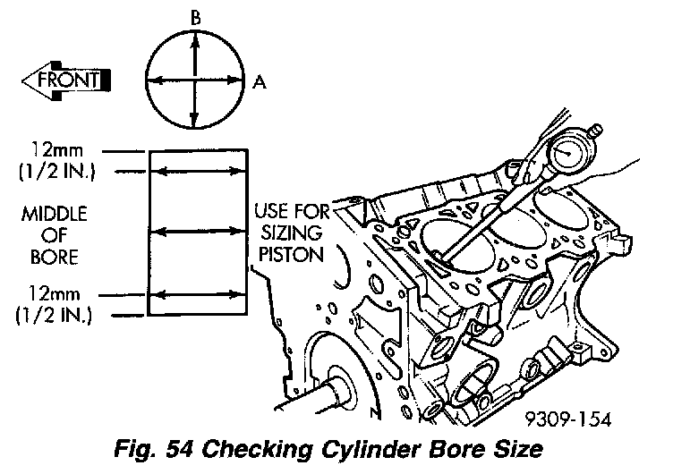 Measure the cylinder bore at three levels in directions A and B (Fig. 54). Top measurement should be 12 mm (0.50 in.) down and bottom measurement should be 12 mm (0.50 in.) up from bottom of bore.