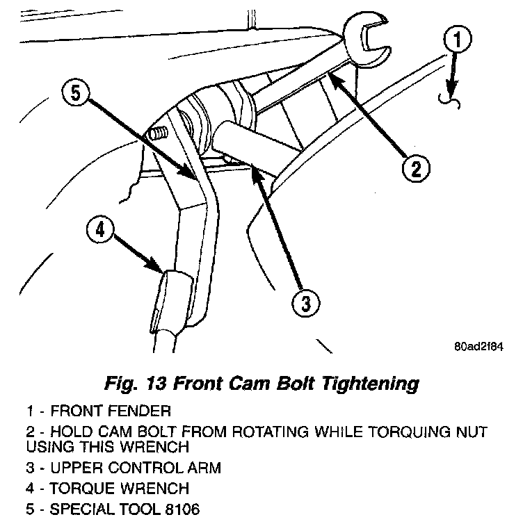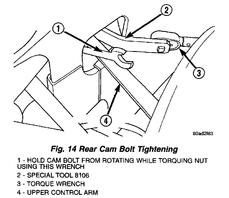 NOTE: When tightening the upper control arm pivot (cam) bolts using Adapter, Special Tool 8106, the mechanical advantage of a torque wrench is increased by a factor of 1.5. For this reason, the actual torque wrench reading or setting will be lower then the torque specification. Example: If the torque specified is 108 Nm (80 ft. lbs.) the torque wrench reading or setting should be 72 Nm (53 ft. lbs.).