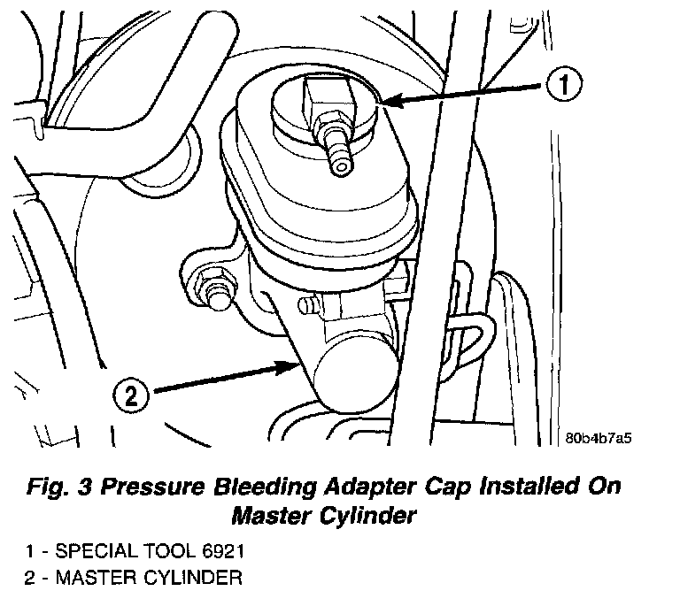 2. Install the Adapter Master Cylinder Pressure Bleed Cap, Special Tool 6921, on the fluid reservoir of the master cylinder. Attach the fluid hose from the pressure bleeder to the fitting on Special Tool 6921.