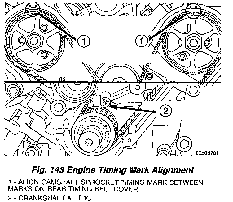 6. Rotate engine clockwise until crankshaft mark aligns with the TDC mark on oil pump housing and the camshaft sprocket timing marks are between the marks on the rear covers (Fig. 143).