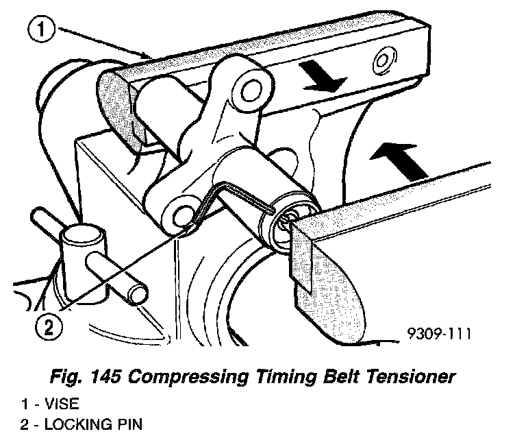 10. Place the tensioner into a vise and SLOWLY compress the plunger (Fig. 145). Total bleed down of tensioner should take about 5 minutes.