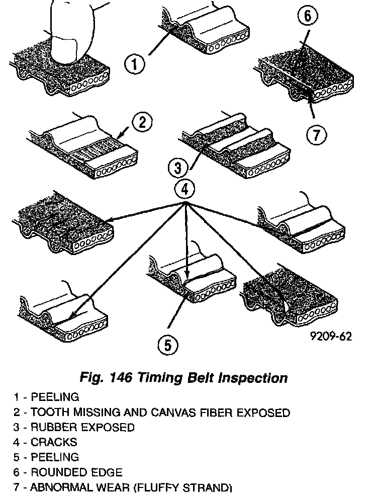 3. Inspect both sides of the timing belt. Replace belt if any of the following conditions exist (Fig. 146):