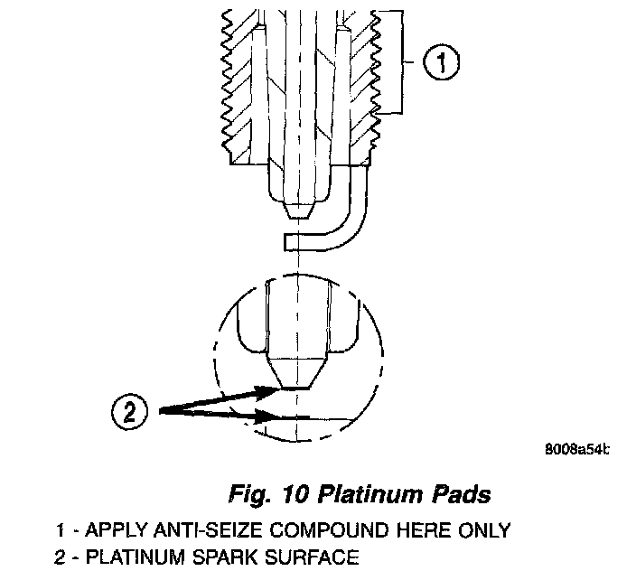 When the spark plugs use a single or double platinum tips and they have a recommended service life of 100,000 miles for normal driving conditions per schedule A in this manual. The spark plugs have a recommended service life of 75,000 miles for severe driving conditions per schedule B in this manual. A thin platinum pad is welded to both or center electrode end(s). Extreme care must be used to prevent spark plug cross threading, misgaping and ceramic insulator damage during plug removal and installation.