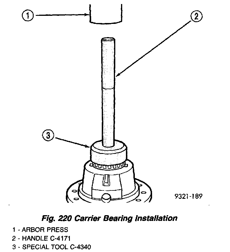 1. Install differential carrier bearings using an arbor press, driver handle C-4171, and Tool C-4340 (Fig. 220).