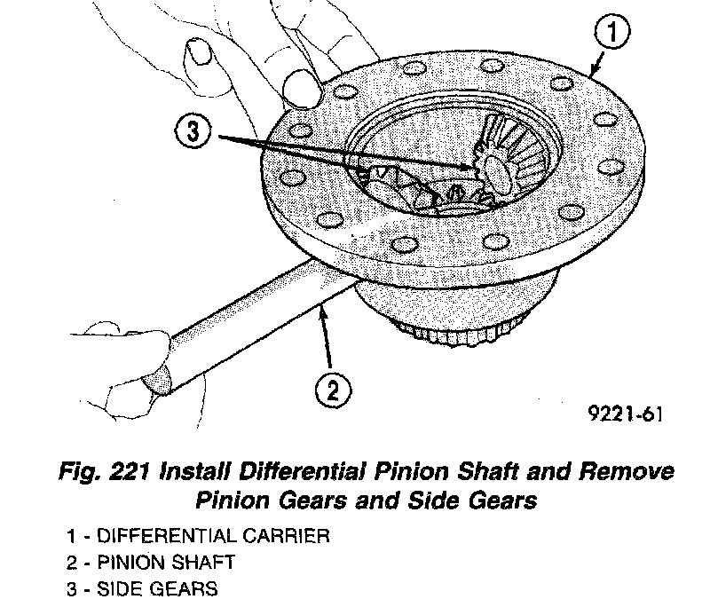 2. Install differential pinion and side gears, and pinion shaft (Fig. 221).