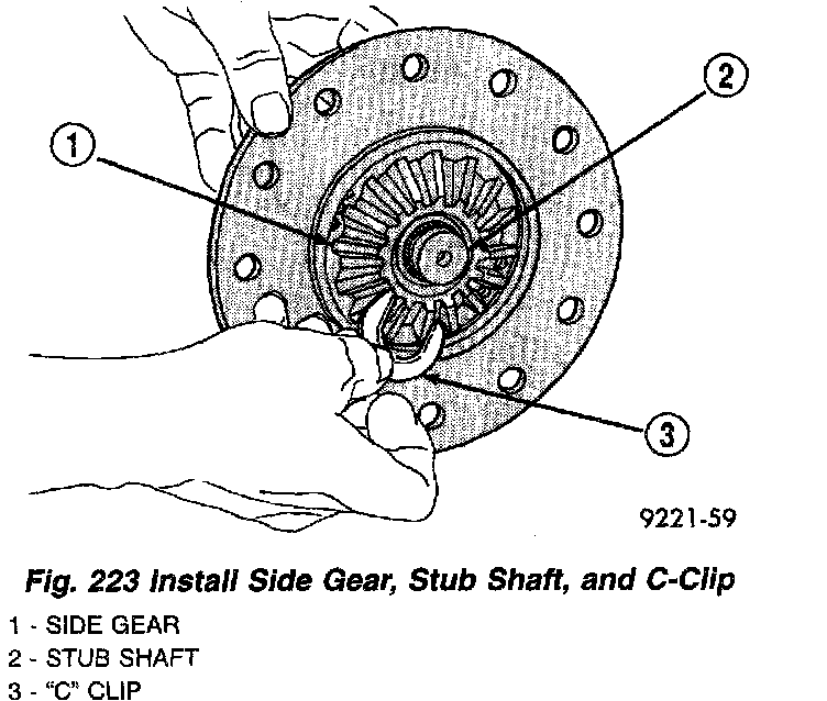 4. Install side gear, stub shaft, and c-clip to differential support plate (Fig. 223).