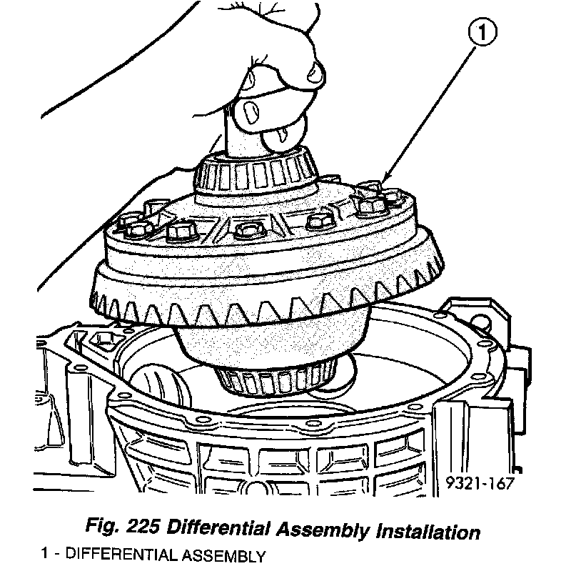 6. Install differential assembly into the transaxle case (Fig. 225).