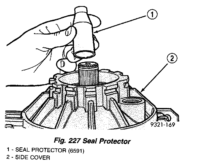 8. Install seal protector (special tool 6591) as shown in (Fig. 227). Apply a thin film of gear oil on the protector.