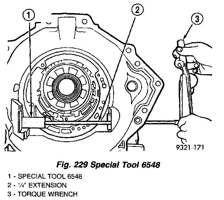 10. Insert special tool 6548 (Fig. 229). This tool will be used to check turning torque of the differential assembly.
