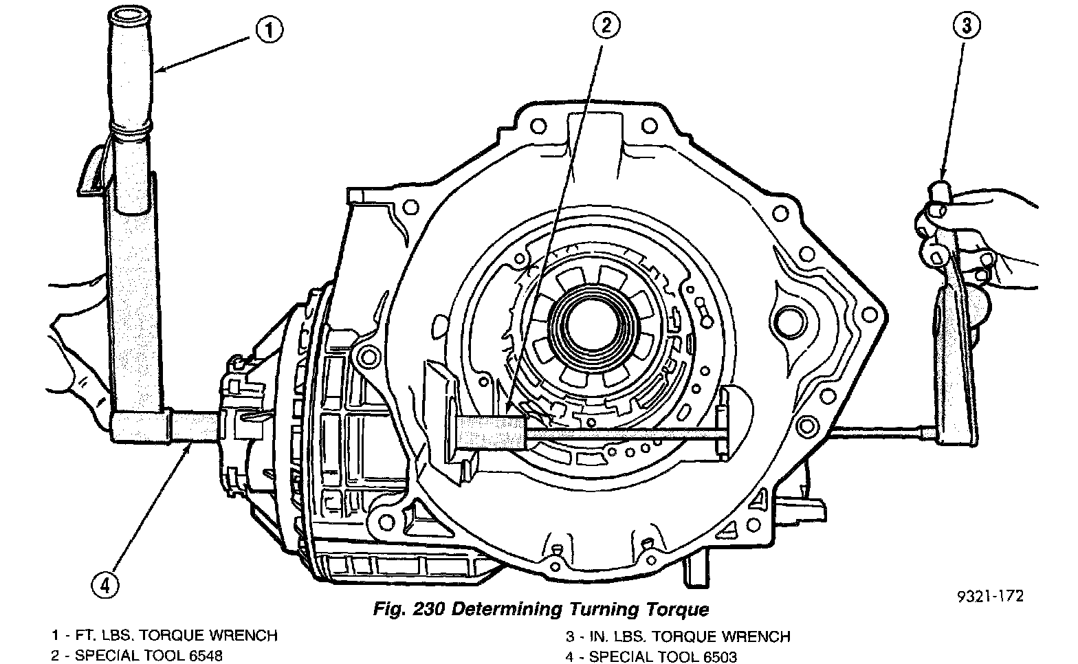 11. Tighten outer adjuster with tool 6503 until 19 to 23 inch lbs. of turning torque is obtained on tool 6548. Record how many foot pounds were required on the outer adjuster to obtain the correct turning torque (Fig. 230). Record the foot pound reading. The reading that you are recording will be used in Step 35 of this procedure.