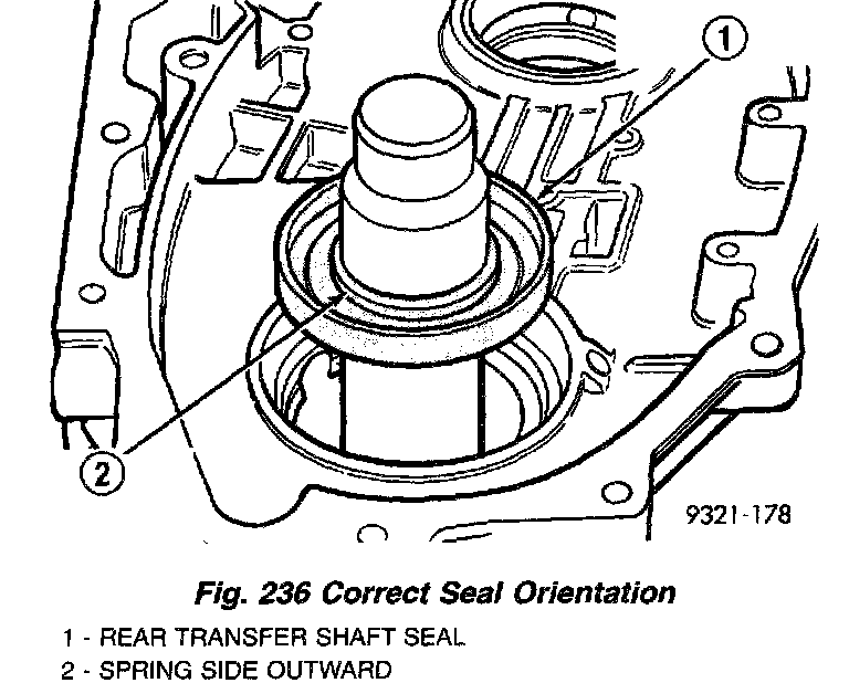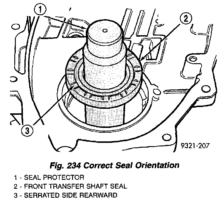 17. Apply a small amount of lube to seal lips and install front transfer shaft seal. The serrated edges must face toward the rear of the transaxle (Fig. 234).