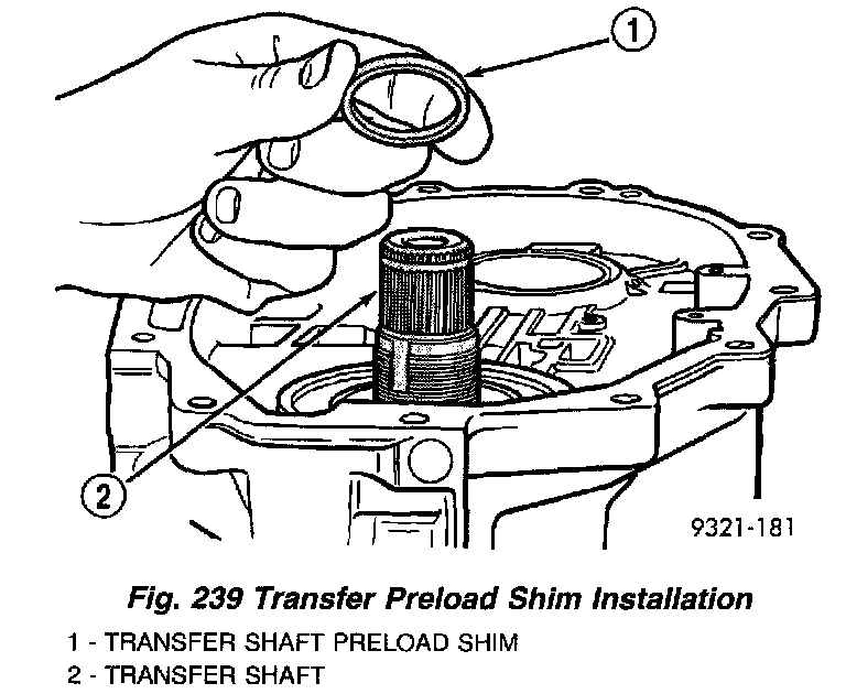 22. Install Transfer shaft preload shim (Fig. 239). Use the original shim that was taken out of transaxle if possible. If original shim is not available, use the thickest shim as a starting point. Refer to Transfer Shaft Rear Shim Chart for available sizes.