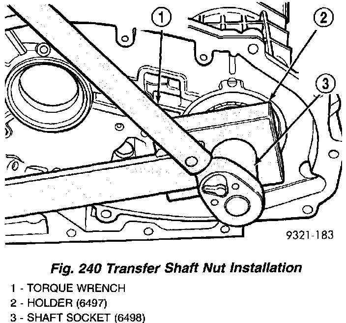 25. Install a new transfer shaft nut (Fig. 240). Tighten nut to 271 Nm (200 ft. lbs.). Use special tools 6497 holder and 6498 shaft socket to tighten nut.