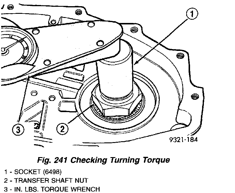 26. Check the turning torque of the transfer shaft using a torque wrench (Fig. 241). The turning torque should be 0.5 to 1.3 Nm (5 to 12 inch lbs.). If the turning torque is too high, install a thicker transfer shaft preload shim. If the turning torque is too low, install a thinner transfer shaft preload shim.
