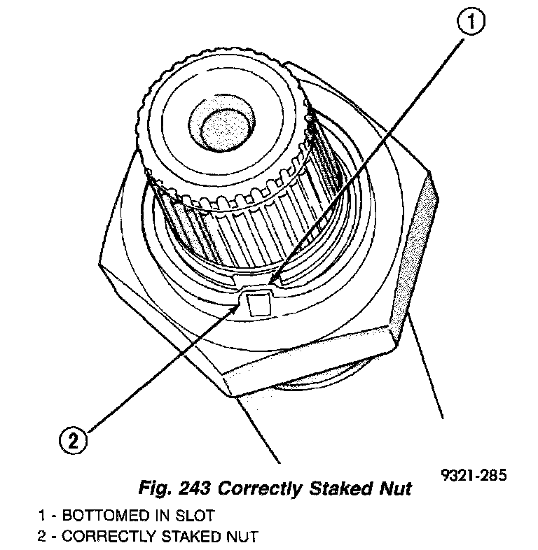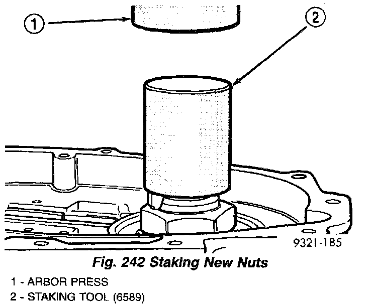 27. After the correct turning torque is obtained, use special tool 6589 to stake the new transfer shaft nut (Fig. 242) (Fig. 243). Be sure that the tool arms line up with slots in the transfer shaft. Use a press with the special tool to make the stakes in the nut.