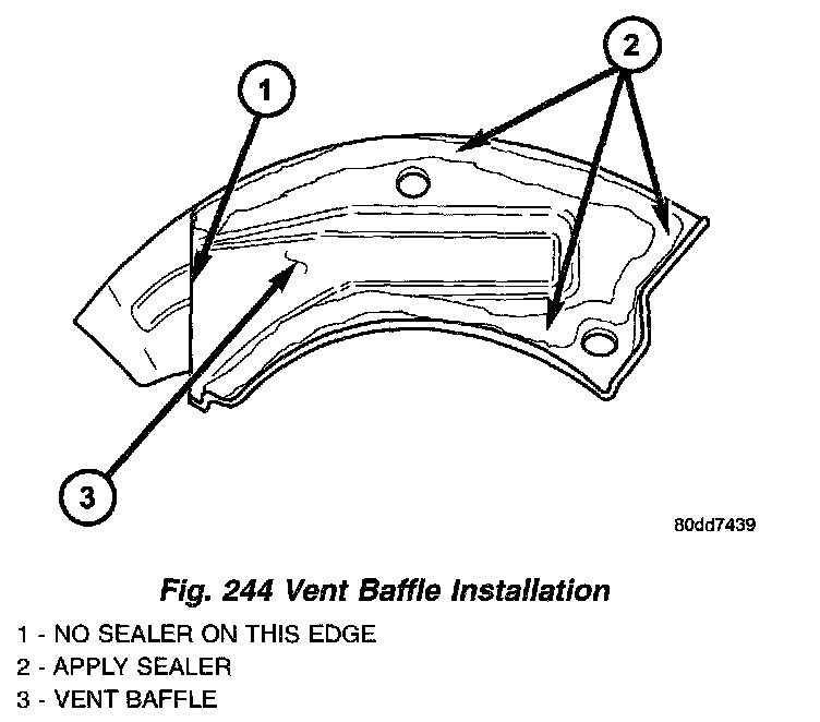 29. Install vent baffle. Apply sealer as shown in (Fig. 244).