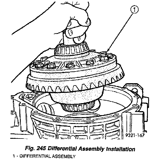 31. Install differential assembly (with ring gear attached) into transaxle case (Fig. 245).