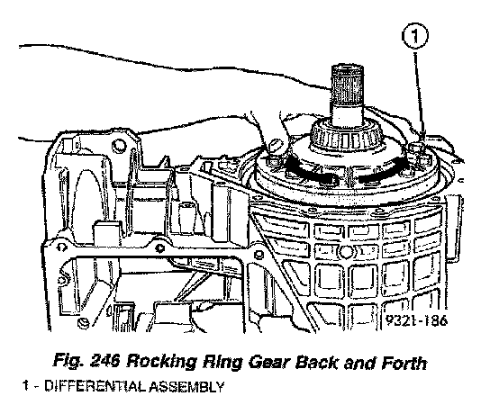 32. Transfer shaft to ring gear backlash should be 0.006" to 0.009" thousands of an inch. To get the backlash close enough to measure, perform the following steps. Hold the transfer shaft with one hand and rock the ring gear back and forth (Fig. 246). You should feel some backlash between the gears. If no backlash is felt use special tool 6502B to turn the inner adjuster so that it raises the differential assembly. This will increase backlash. If there is to much backlash, use special tool 6502B to turn the inner adjuster so that it lowers the differential assembly. This will decrease backlash. Recheck the backlash after each adjustment.