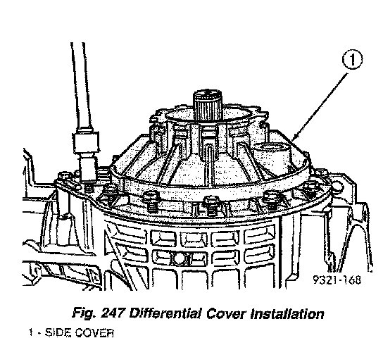 33. Apply a 1/8 inch bead of sealant to differential cover flange. Then install differential cover with sealant (Fig. 247) and tighten cover bolts.