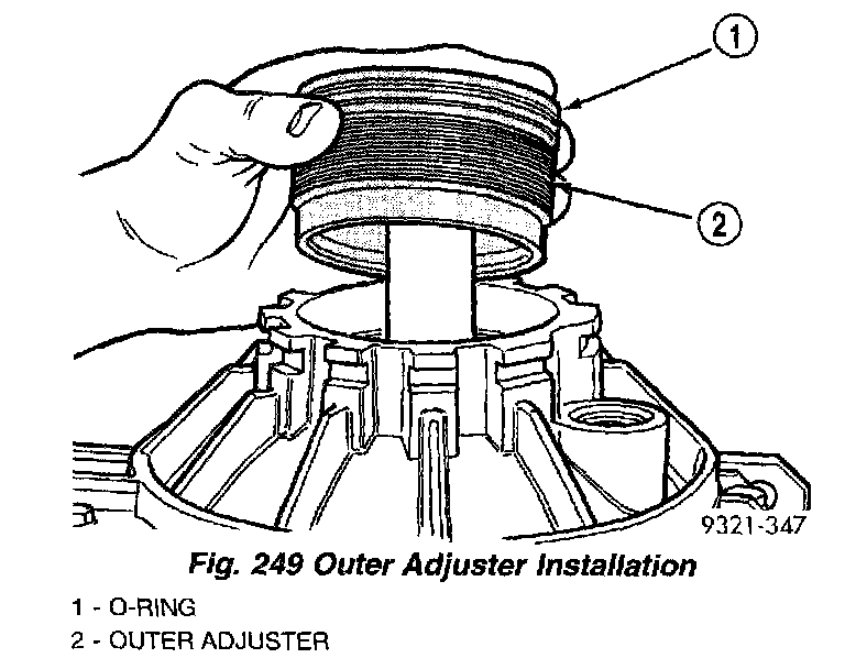 35. Install outer adjuster with new O-ring (Fig. 249). Torque the outer adjuster (special tool 6503) to the torque reading recorded in Step 11. Then seat bearings by turning differential three or four revolutions in both directions. Tighten adjuster a second time to same torque recorded in Step 11. Again reseat bearings. Repeat this sequence until correct adjuster torque is maintained.