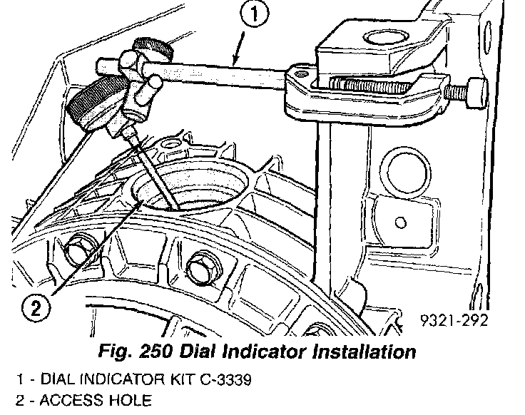 36. To check and/or adjust backlash, remove the inspection plug from the top of the differential. Install dial indicator as shown in (Fig. 250). The tip of the dial indicator must be perpendicular against one of the ring gear teeth. Hold transfer shaft with locking pliers. Move ring gear back and forth with special tool 6548. Read the amount of backlash with dial indicator.