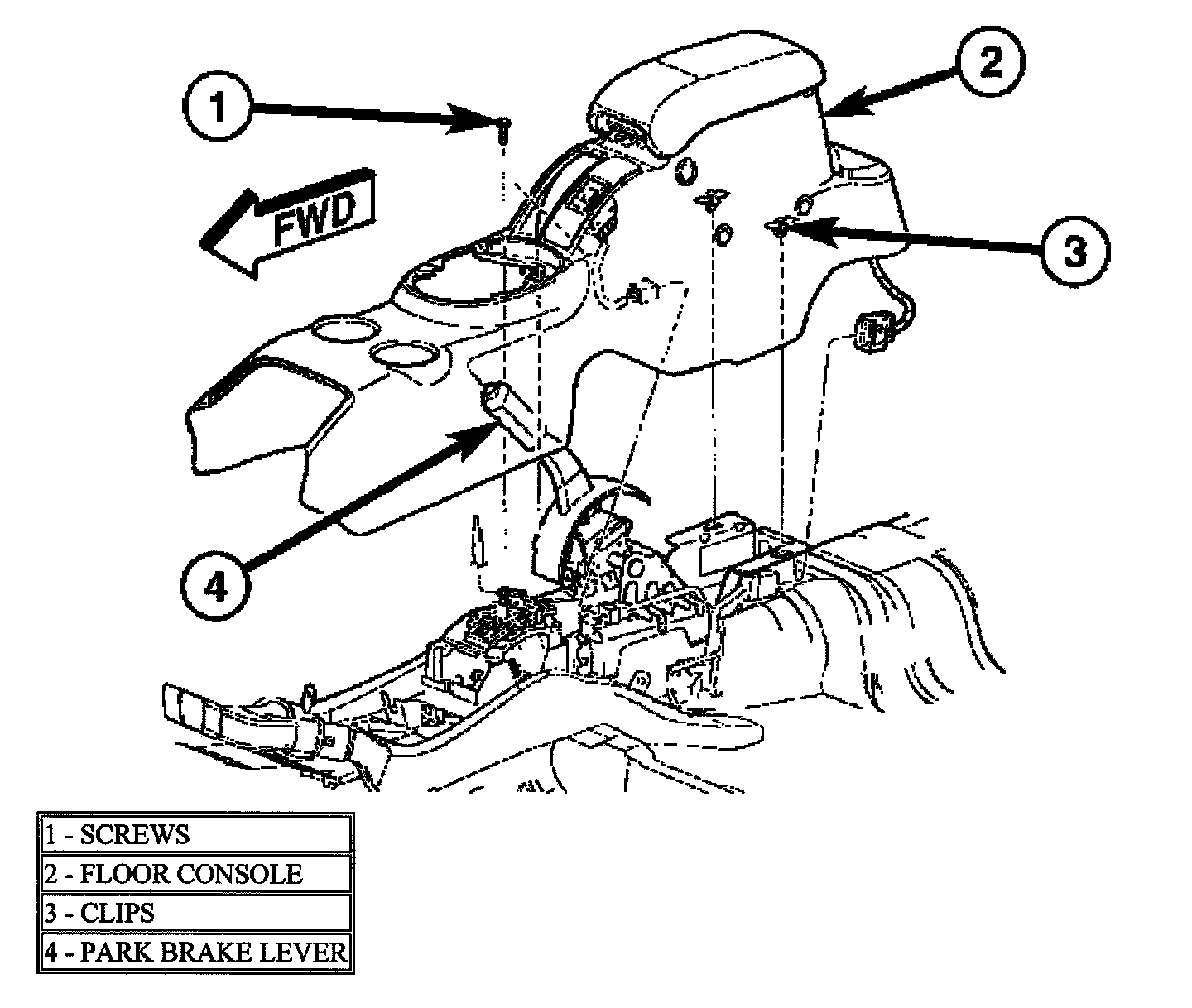 6. Remove screws, next to floor shifter and in console storage compartment, attaching floor console to brackets on floor pan.