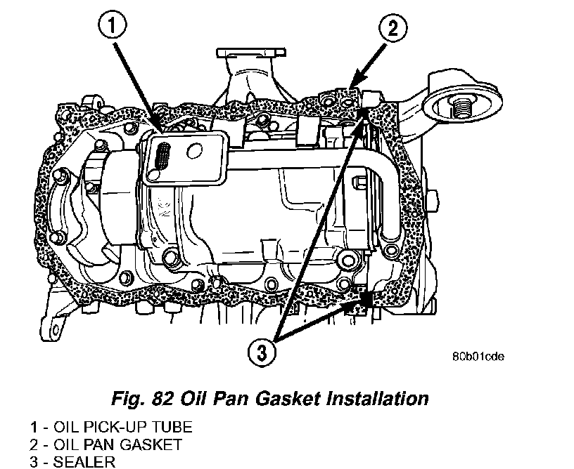 1. Apply Mopar Engine RTV GEN II at the oil pump to engine block parting line (Fig. 81).