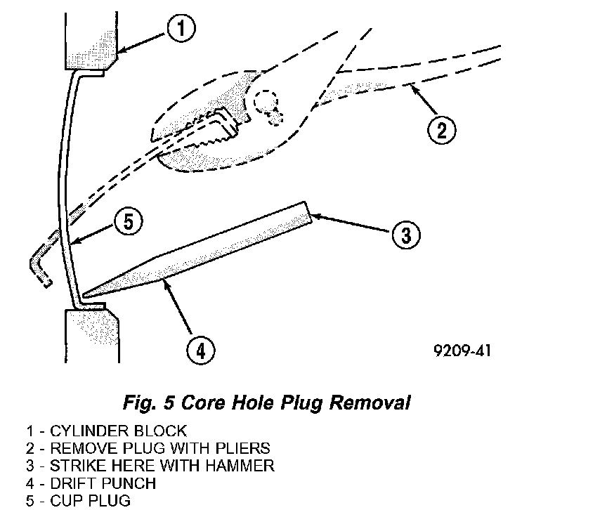 ENGINE CORE AND OIL GALLERY PLUGSUsing a blunt tool such as a drift and a hammer, strike the bottom edge of the cup plug. With the cup plug rotated, grasp firmly with pliers or other suitable tool and remove plug (Fig. 5).