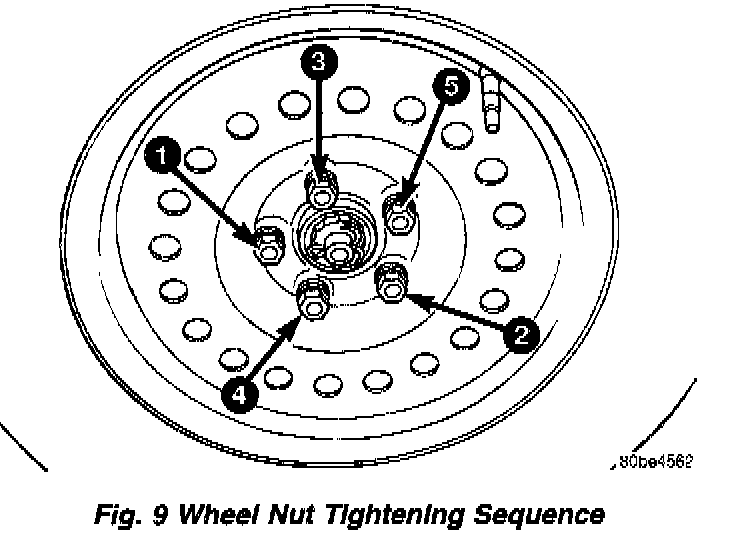2. Install and progressively tighten the five wheel mounting (lug) nuts in the proper sequence until half the specified torque is reached. Repeat the sequence, tightening the wheel mounting (lug) nuts to a final torque of 135 Nm (100 ft. lbs.).