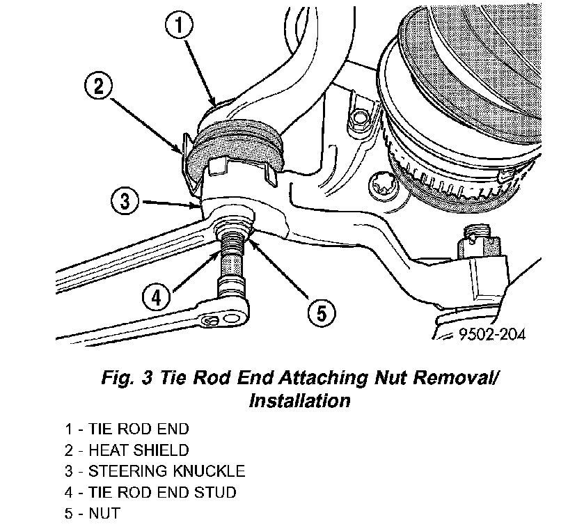 CAUTION: When installing tie rod on steering knuckle the heat shield must be installed. If heat shield is not installed, tie rod seal boot can fail due to excessive heat from brake rotor.